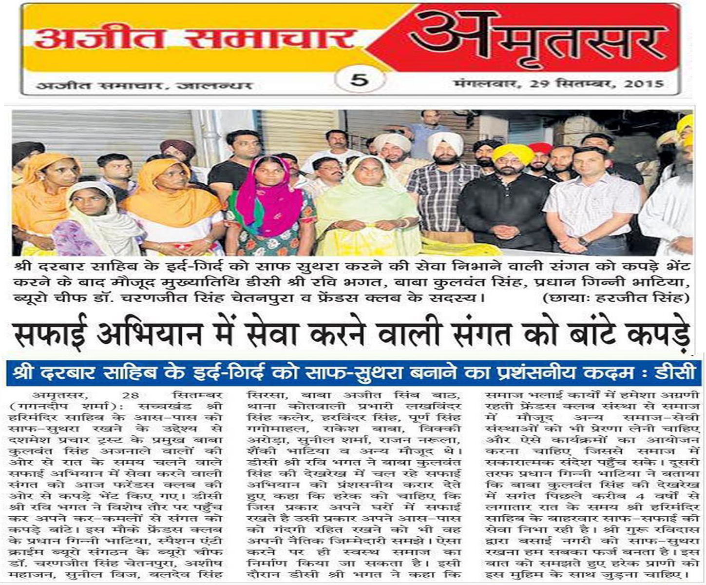 | SFAI ABHIAN MEI SEWA KARNE WALI SANGAT KO BANTE KAPARHE Dated (29-09-2015) |